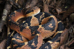 Additionally, the South American Bushmaster has a conflictive relationship with human communities throughout its range due to its perceived danger and the risk of venomous bites. As a result, its populations face significant threats, often becoming targets of intentional killings and road mortality. These threats, along with deforestation and habitat loss, are driving its populations into decline, leading to its classification as an endangered species by the IUCN.